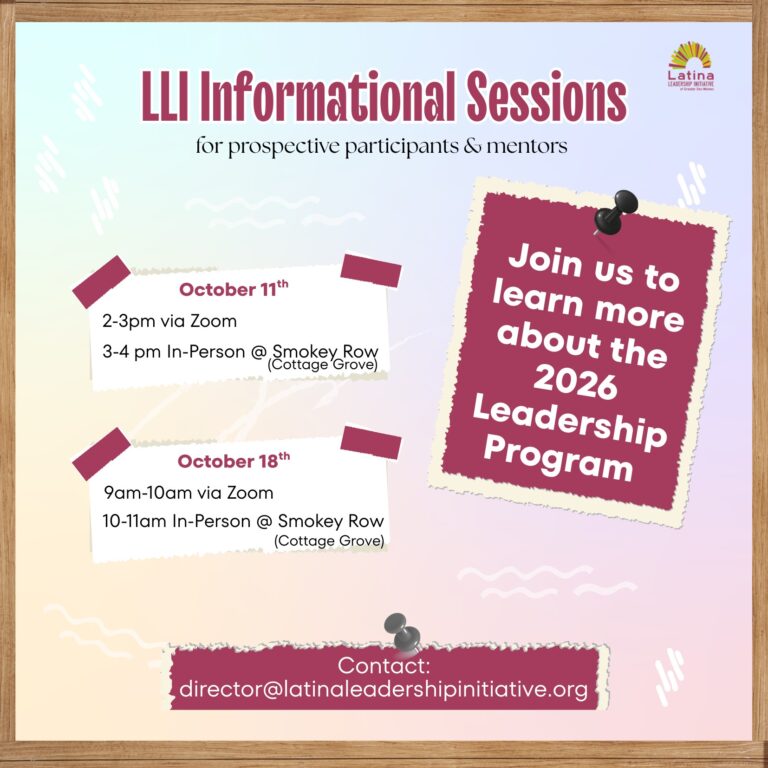 Are you interested in applying for the 2026 Leadership Program or getting involved as a mentor? Join one of our informational sessions to connect with our team, ask questions, and learn how the program can support your growth and success. These sessions are designed to provide valuable insight into the program’s benefits and opportunities for both participants and mentors. To RSVP, please email Socorro at director@latinaleadershipinitative.org or call 515-661-4501.
