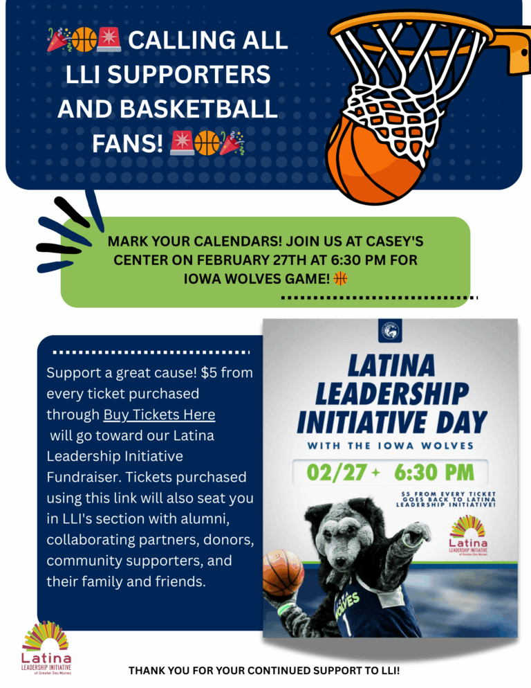 Join us Saturday, March 16th at 7 pm at the Wells Fargo Arena for our Empower the Court & Latina Leadership fundraiser! We will have games and fun items to give away at the event to celebrate Latino/Hispanic Heritage night at the Iowa Wolves. Tickets are $20 and half of ticket proceeds will return directly to Latina Leadership Initiative’s Leadership Program offerings and tuition scholarships.